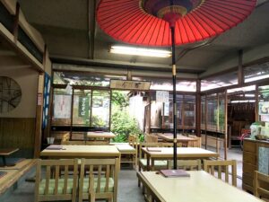 1950年ごろ創業の本家とろろそば 「柚之茶屋」。苔寺エリアの緑豊かで静かな店内で、名物とろろそば「苔の月」をぜひご賞味あれ。