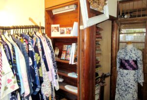桂駅から徒歩約5分。ノスタルジックな雰囲気を放つ、アンティーク着物レンタルとデニム着物のセレクトショップです。明治34年、京都室町に呉服商として創業したのが始まりです。